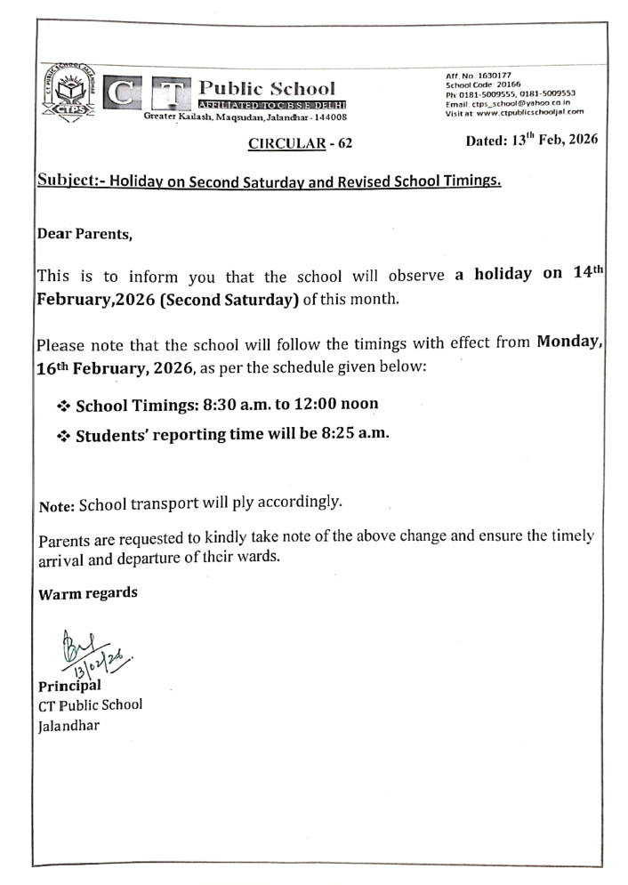 Holiday on Second Saturday and Revised School Timings