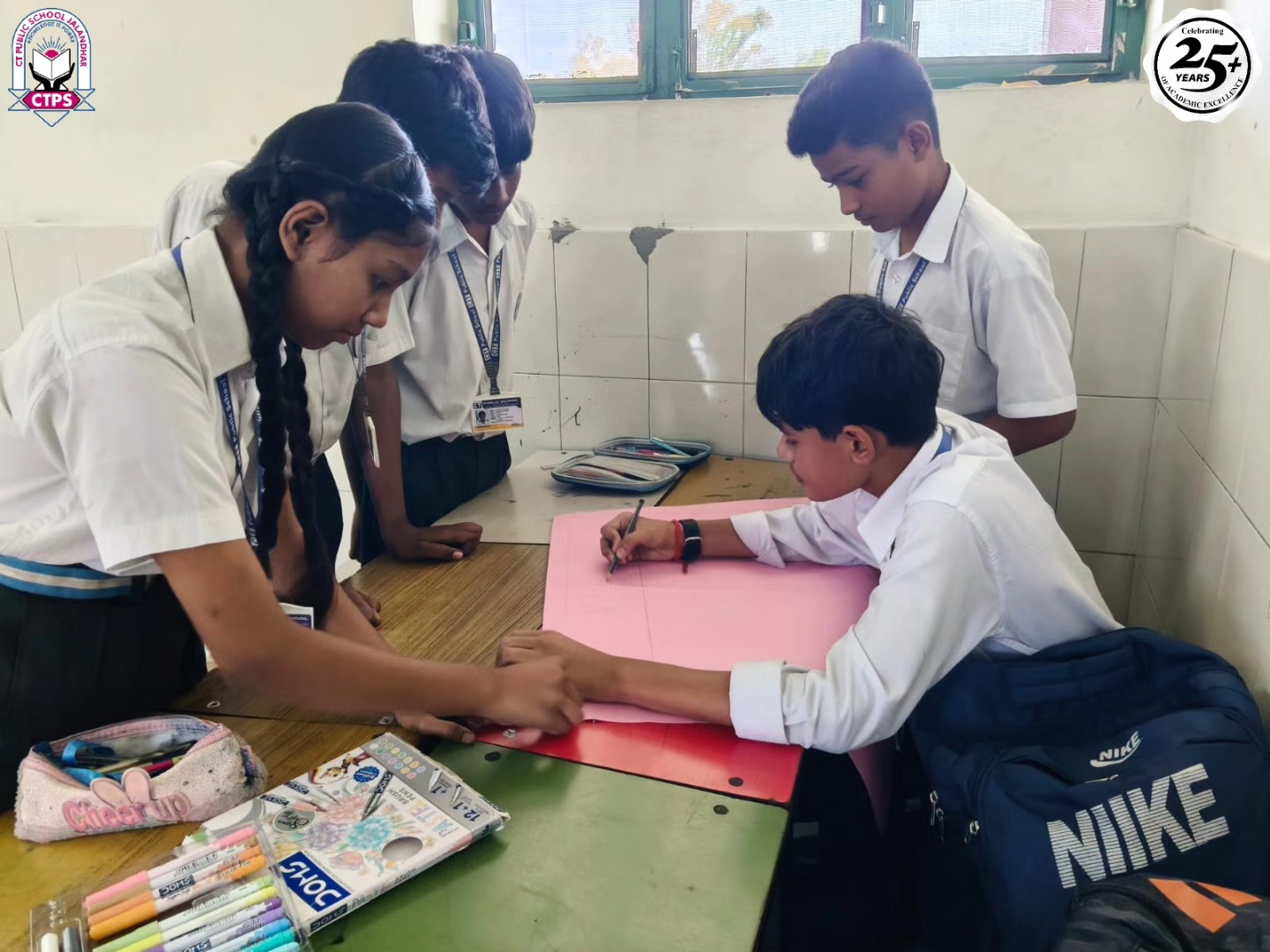 A group activity on Notice Writing was conducted for Grade 7 students. They were divided into groups and asked to prepare the format of a notice on chart paper. The activity encouraged peer learning, teamwork, and creativity. Students learned the correct format, improved their writing skills, and enjoyed learning through collaboration.
